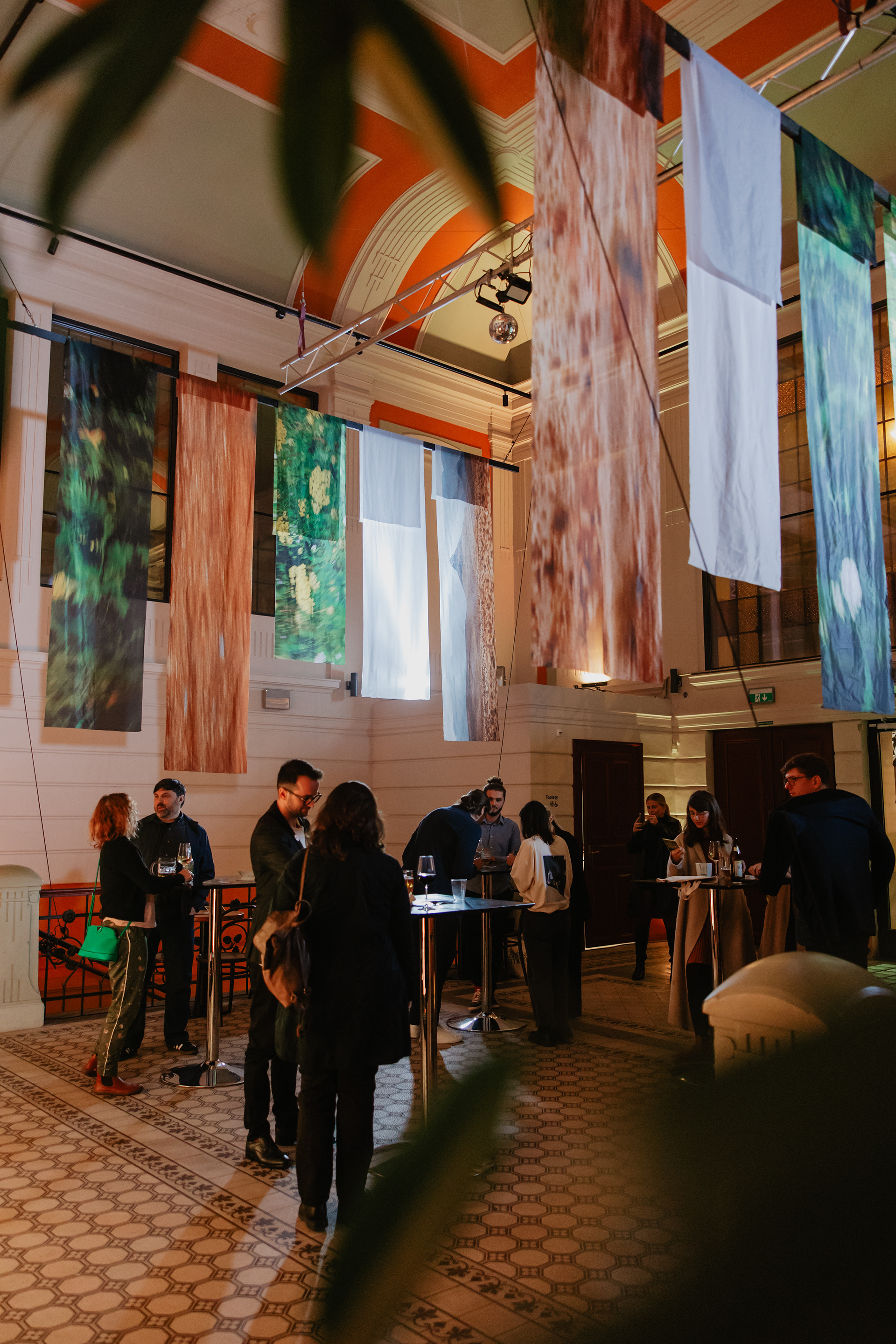Další instalace textilií ve vstupních prostorách Moving Station oživila festivalové centrum i předsálí — lehké tkaniny reagovaly na světlo a pohyb lidí kolem.